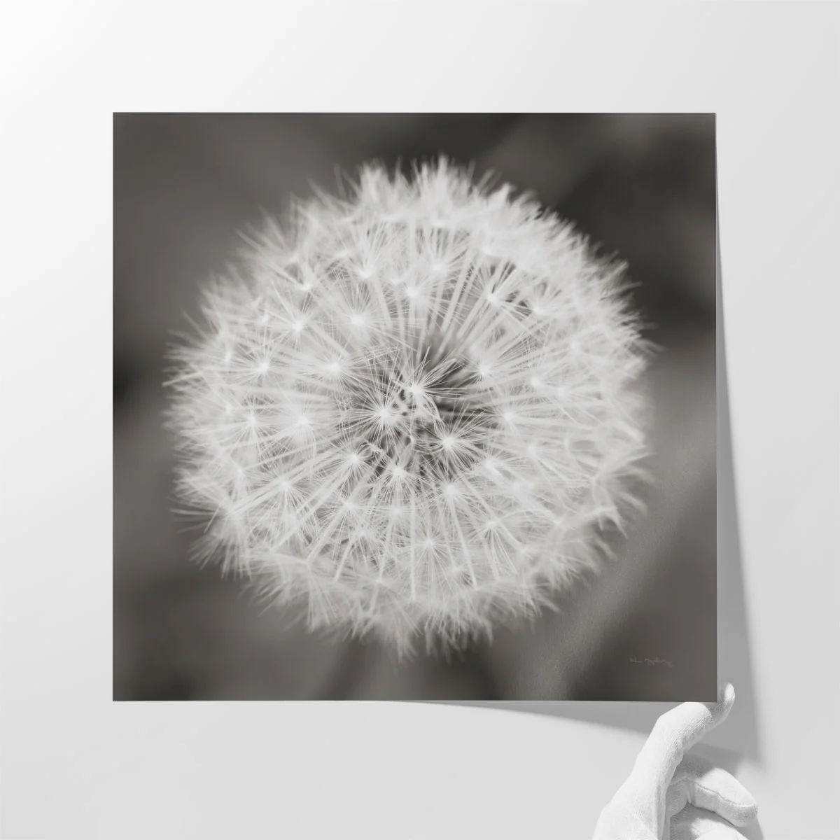 This striking photography piece features a black and white depiction of a dandelion seedhead, capturing the delicate beauty of floral and botanical elements in a timeless style.