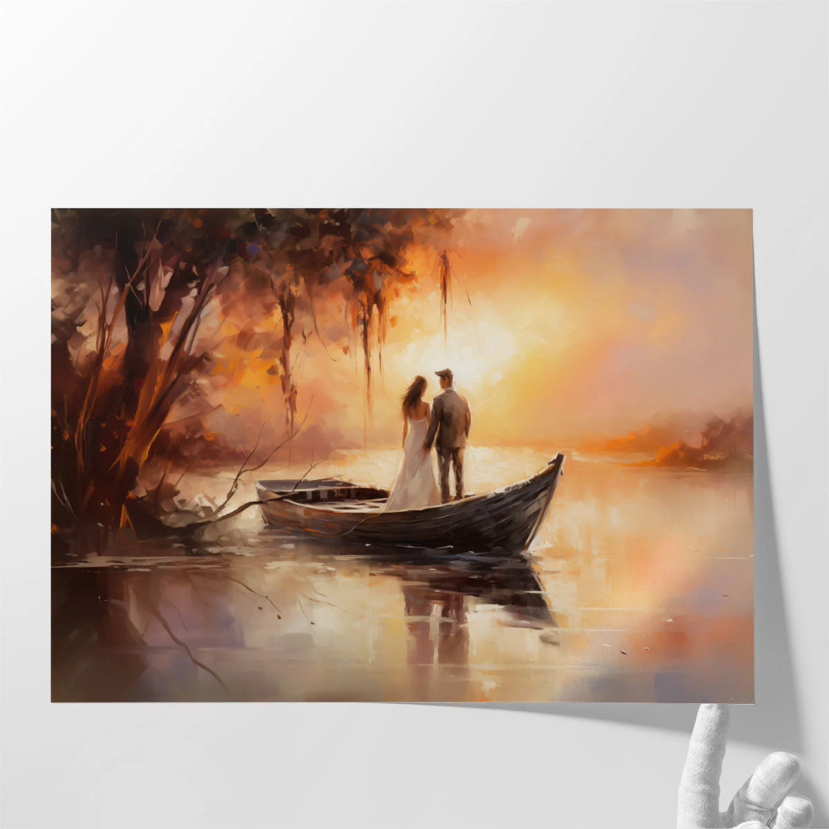 This artwork captures a serene moment of love with a couple in a boat by a tree, painted in warm brown hues.